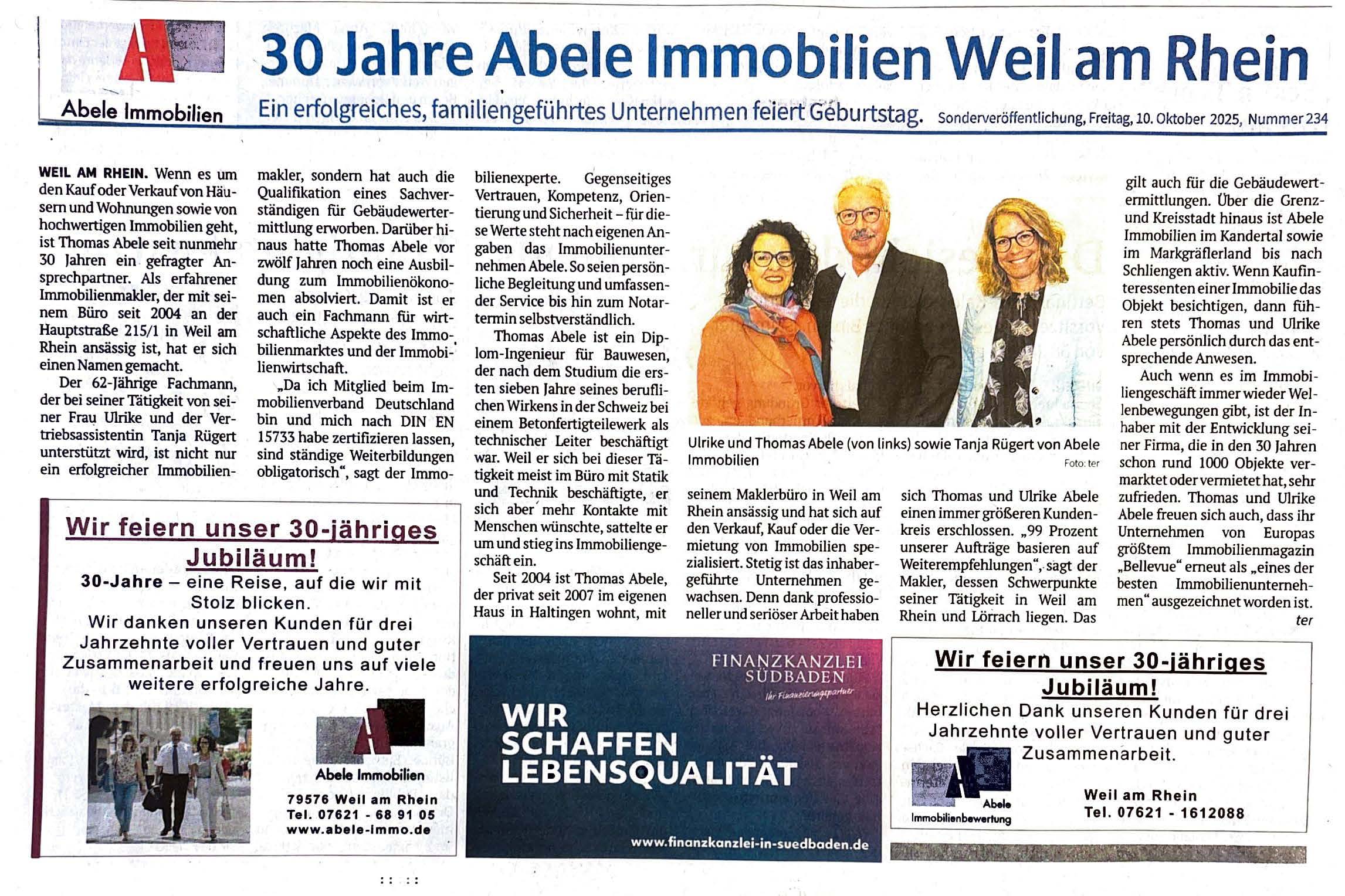 1995 öffnete Abele Immobilien seine Türen. Was damals mit viel Leidenschaft und einer Vision begann, hat sich zu einem erfolgreichen Unternehmen entwickelt, das stolz auf zahlreiche vermittelte Immobilien und langjährige Beziehungen blicken darf.